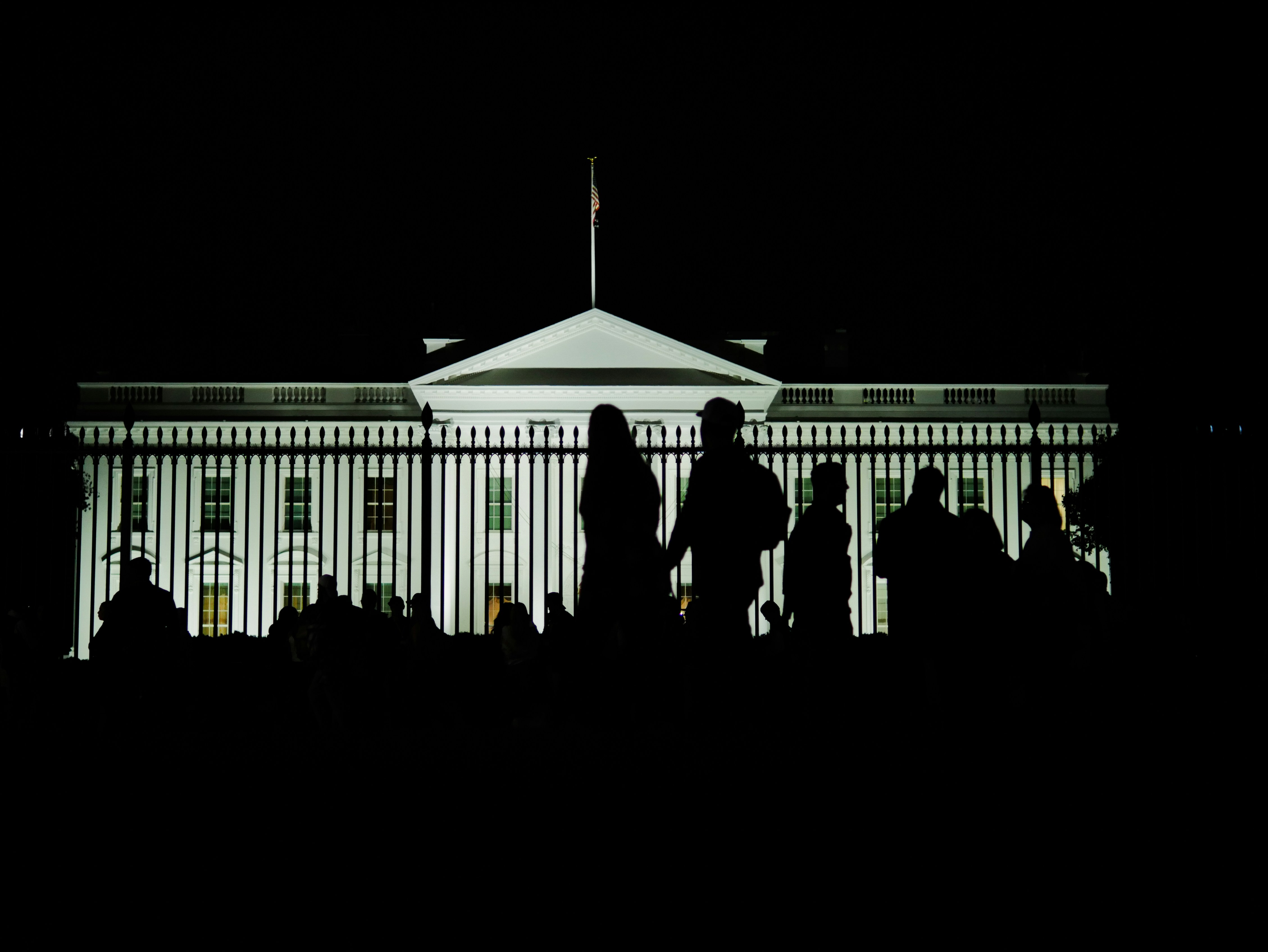 Image Description: A photo of the White House at night with shadows of people in front of it.